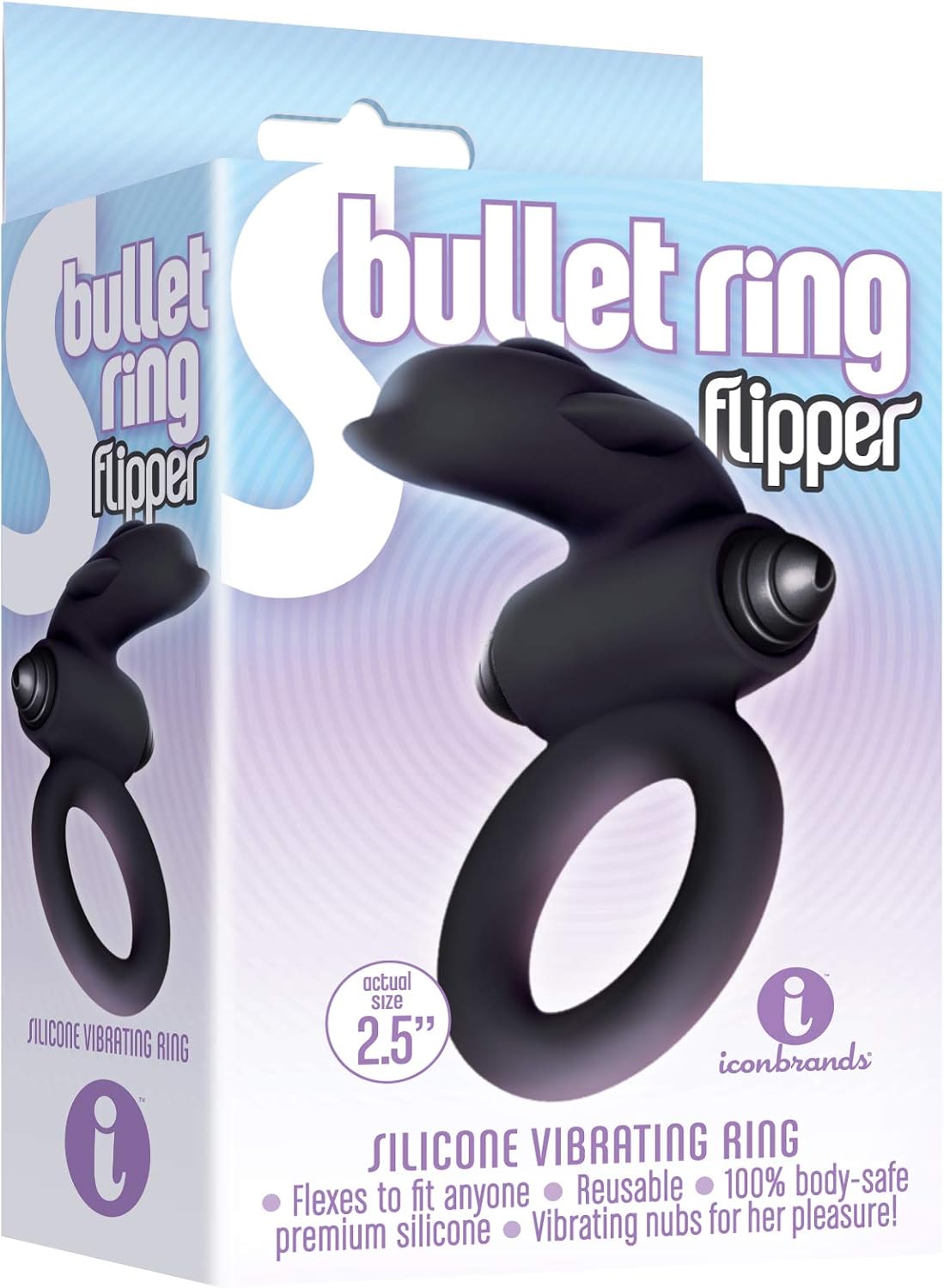 The 9's S Bullet Ring is a silicone vibrating ring that flexes to fit anyone. Reusable. Silicone. Vibrating nubs for her pleasure closely resemble the shape of a tongue. From Icon Brands..One Year Warranty.